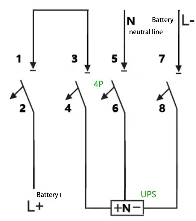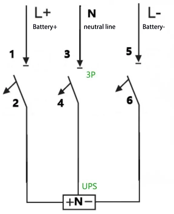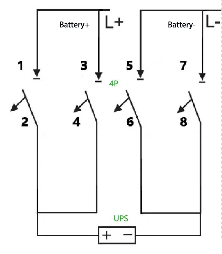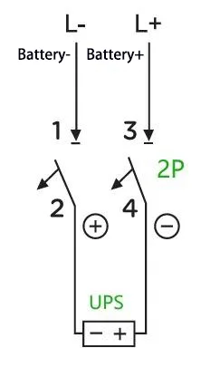 ه:على سبيل المثال: بالنسبة إلى UPS بسعة 40 كيلو فولت أمبير، وسلسلة بطارية مصنفة مكونة من 40 خلية، ووصلة سلكية محايدة (معادلة جهد الشحن: 14 فولت × 40 = 560 فولت، أي ±280 فولت)، يتم حساب الحد الأقصى لتيار التشغيل على أنه 40 كيلو فولت أمبير × 1.0 ÷ 90% ÷ 10 فولت ÷ 40 = 111 أمبير. A 4P 750 فولت 150 يمكن اعتماد قاطع الدائرة الكهربائية، مع توصيل اثنين من أقطابه على التوالي. طريقة الأسلاك هي كما يلي: