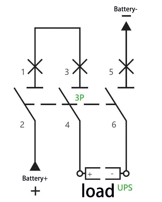 ج:على سبيل المثال: بالنسبة لوحدة UPS بسعة 40 كيلو فولت أمبير وسلسلة بطارية مصنفة مكونة من 32 خلية (معادلة جهد الشحن: 14 فولت × 32 = 448 فولت؛ هناك أيضًا بطاريات بجهد شحن عائم يبلغ 13.6 فولت فقط، والذي يستخدم هنا لأغراض التوضيح فقط)، يتم حساب الحد الأقصى لتيار التشغيل على أنه 40 كيلو فولت أمبير × 1.0 ÷ 90% ÷ 10 فولت ÷ 32 = 139 أمبير (بافتراض أن عامل الطاقة 1.0، وكفاءة 90%، وجهد قطع مجموعة UPS يبلغ 10 فولت لكل خلية). في هذه الحالة، يكون قاطع الدائرة 2P 500 V 200 A كافيًا. طريقة الأسلاك هي كما يلي: